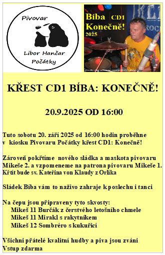 Středa 15.10. 2025 Počasí nestojí za nic, ale zase rostou houby i houbičky V pátek začínáme hrát naživo v kiosku. Tento pátek 17.10. kolem 18:00 zatopíme v kiosku a spolu s Kateřinou z Orlíku a Ludenic si zahrajeme nějaké country a folk. Pokud bude zájem, předvedu i nějaké písničky z nového CD2 Nekonečně! Rum na zahřátí bude zdarma. Hudební pátky by mohly být pravidelné, zveme všechny pouliční muzikanty na pivo a zpěv. Tento web nově najdete pod oficiální doménou pivovarhancar.cz Za dlouhých podzimních večerů zkusím na stránce máknout. Aktuální info o akcích a pivu najdete také na FB Libor Hancar. Pokud chcete mít on-line informace , požádejte o FB přátelství a stanete se členem klubu přátel našeho pivovaru. Dnes je na čepu Mikeš 11 ze zeleného chmele a kukuřičná M12. Chystám várku polotmavé M13 a konečně jsem sehnal flašku dusíku na výrobu velvetu.
